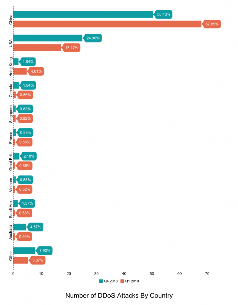 According to the findings, China reported the highest number of DDoS attacks i.e. 67.89% while the U.S. reported the second largest number of DDoS attacks i.e. 17.17% and Hong Kong reported 4.81% of DDoS attacks in the first Quarter of 2019.